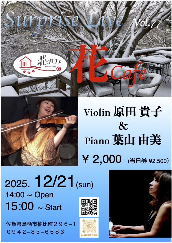 来る12月21日()にヴァイオリン 原田貴子さんピアノ 葉山由美さんをお招きして、Surprise Live Vol.77を開催いたします。